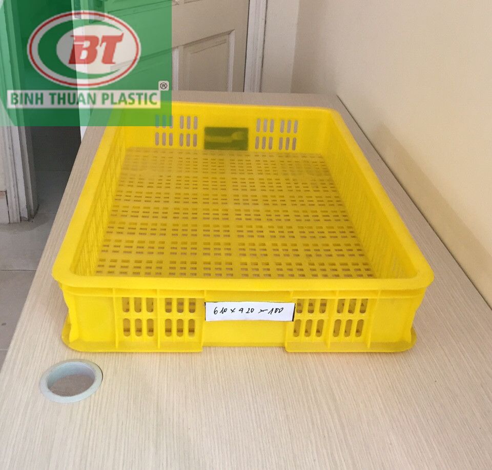 - Thùng nhựa rỗng, sóng hở công nghiệp HS010 được thiết kế với kích thước phủ bì 610*420*100 mm thường dùng đựng rau củ quả xuất khẩu, quần áo, phụ kiện ngành may mặc, bát đũa trong gia đình, nhà hàng, khách sạn.